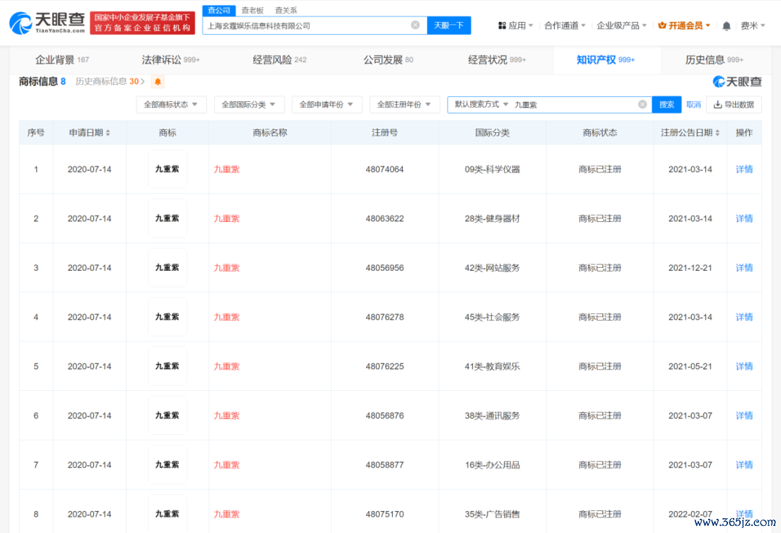 天眼查学问产权信息默契,刊载该演义的起初汉文网斟酌公司上海玄霆文娱信息科技有限公司已得手注册多枚“九重紫”商标,海外分类为科学仪器、健身器材、网站处事、社会处事等。此外,还有某酒业公司以及多名当然东说念主已央求注册“九重紫”商标,海外分类包括便捷食物、教师文娱等,除部分被驳回外,多枚商标已完成注册。